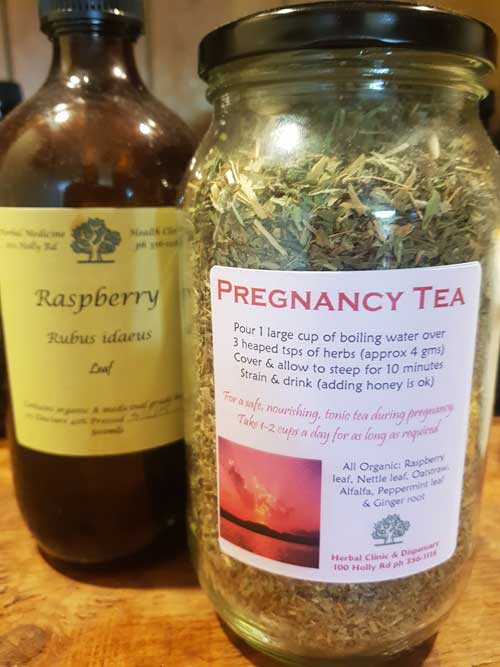 The amounts given above would approximately fill one large, 1 litre jar and this sample of a Pregnancy tea could easily be adapted to individual needs or preferences and if, as often is the case, a woman was very particular about how things tasted in her pregnancy, it might be wise to get the dried herbs separately and then to experiment with using more or less of them until a combination was found that gave the most agreeable flavour.